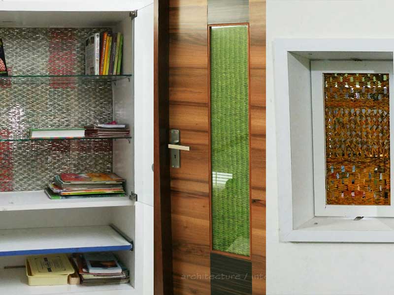 So, when an architect asked us to weave our warps and wefts into frames and panels that would provide artistic relief to the walls, all we could say was “Done.” Here are pictures of doors to patios and living spaces that have our newspaper weaves embedded in them. Take a close look.